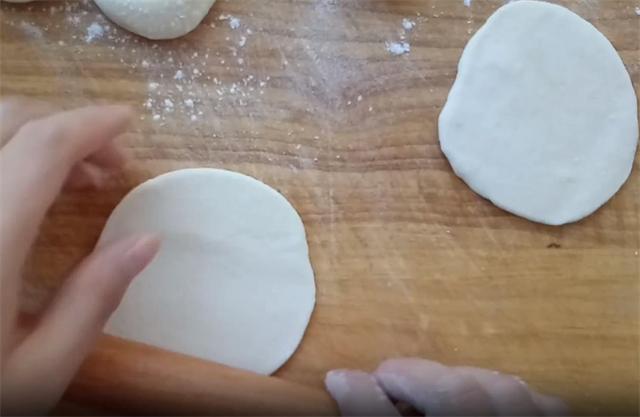 3.然后把切好的面揉成圆形的小面团,把面团擀成3毫米厚的面饼。