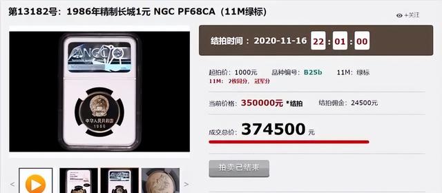 在一次硬币拍卖会上以37.45万成交,可以说是目前最贵的一枚长城币,是不是可以换辆小汽车了,这枚一元硬币就是集稀少、精制、特殊于一身,能拍出这样的天价也就不足为奇了,另外其它年份的长城一元硬币,市价也是不错的,一般流通品的市价也在几十到几百不等,精制币的市价也已经达到几千上万了。www.ws46.com |