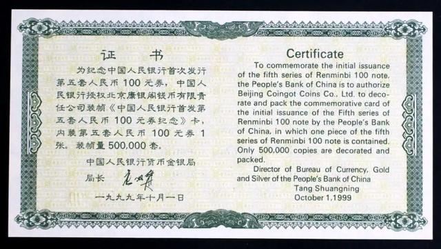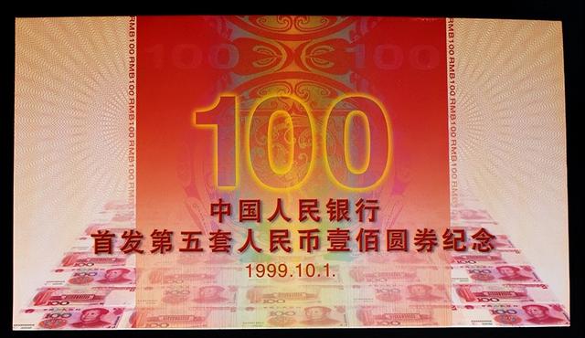 在五版币刚发行的时候,为了纪念这个重大时刻,央妈装帧发行了《中国人民银行首发第五套人民币100元券纪念》卡。