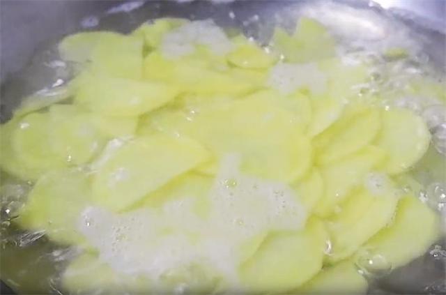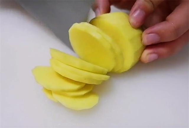 1.每到周末都会给媳妇做这个土豆吃。新挖的土豆去皮洗净,切成厚厚的薄片。