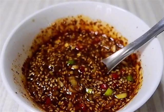 3.再调个凉拌料汁,葱蒜小米辣,加入芝麻、辣椒粉,浇一勺热油炸香。