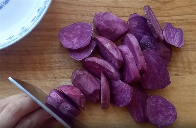 3.然后我们把紫薯切成薄片,上锅蒸15分钟左右。