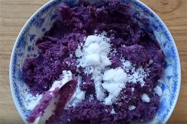 5.然后把蒸好的紫薯用勺子碾碎,再加入两勺白糖搅拌均匀备用。