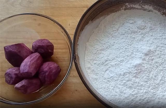 1.今天教大家做香甜软糯的紫薯糯米团。准备材料有糯米粉500克,紫薯500克,首先把紫薯去皮洗净备用。