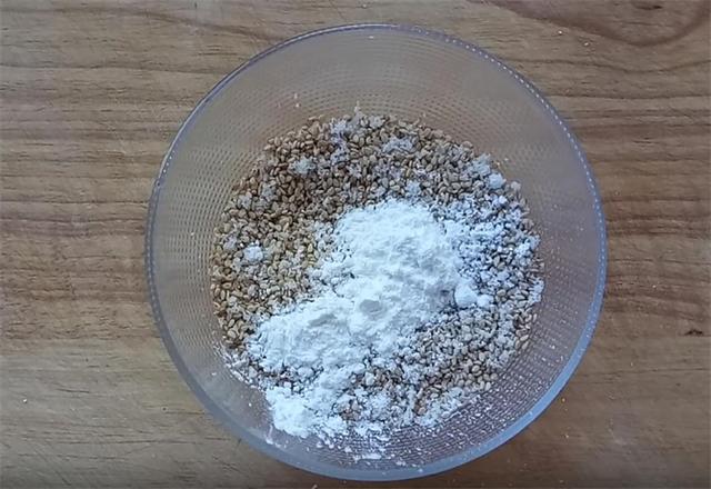 2.再准备熟芝麻30克,加入两勺白糖,不喜欢吃糖的也可以不放,再加入一勺干淀粉搅拌均匀备用。