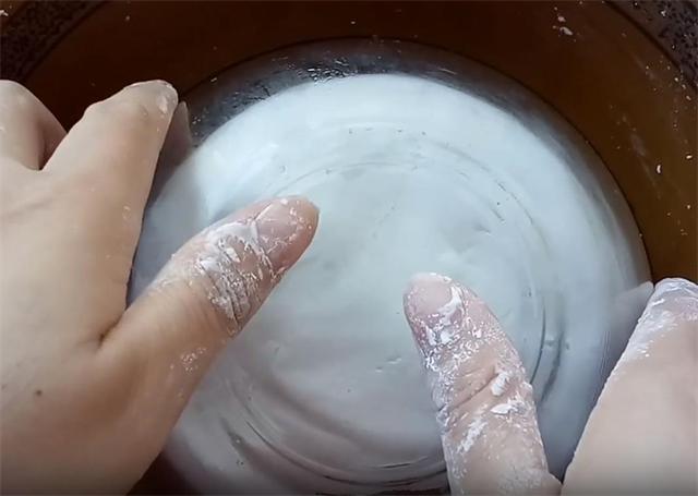 4.接下来我们开始和面,边加水边搅拌,面一定不要和得太软,要硬一些,如果面和软了,蒸好的糯米团会堆下来不成形,面和好后醒面20分钟。