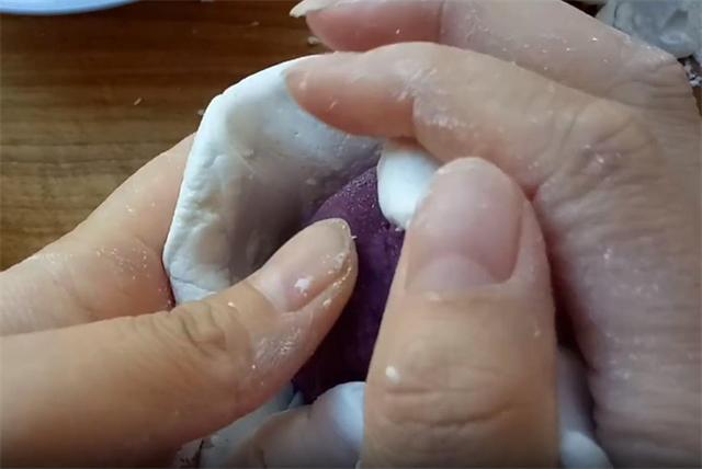7.然后我们取一块面,用食指把面压成薄饼,压到正好能够包下紫薯球大小,然后把紫薯球放到面饼上,像这样虎口用力把面一点点的捏合。