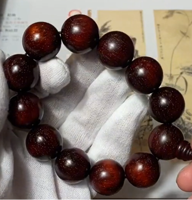 很多人问直播间里99块钱包邮的爆满金星紫檀佛珠是什么?就是图片中这种,商家叫做犀牛角紫檀,行业内叫压缩紫檀,就是把红花梨进行压缩处理然后点上金星,这样棕眼就会显得非常细腻,密度也会非常大,拿到手里沉甸甸的感觉,有点像顶级高密泥料紫檀。