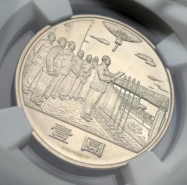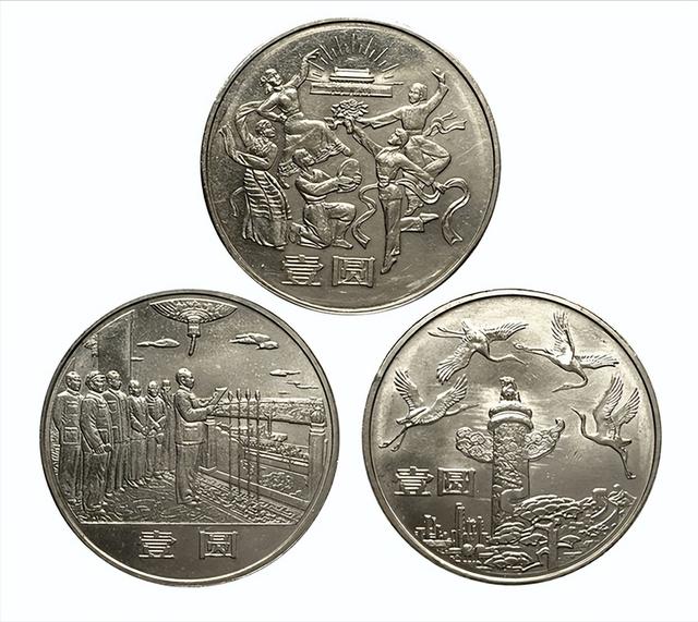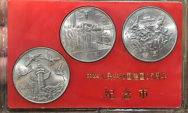 背面图案一枚是开国大典场面,一枚是天安门城楼前,汉蒙藏维高山族人物组成的象征各人民族大团结的民族舞蹈,一枚是由中央华表长青松树、长城和仙鹤组成的祖国万岁的情景,建国35周年纪念币,它的市场溢价在于它的纪念性,它不但是对过去的纪念,更使人们认识到现在的幸福来之不易。