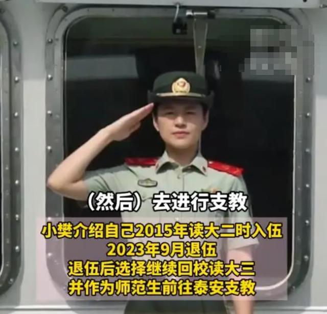 小樊这姑娘,她大二那年,毅然决然地选择了去当兵,这一当就是八年。八年对于一个女孩子来说,那是多么宝贵的青春时光!可是小樊,她就这么义无反顾地献给了祖国的国防事业。 去年九月小樊退伍了。按说一般人退伍后可能都会选择直接找工作或者继续深造,可小樊呢,她选择了回到学校继续读大三,而且还去了泰安支教。这姑娘,真是有情怀啊!