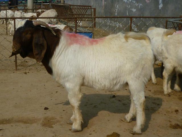 一 纯种波尔山羊的外貌特征 纯种波尔山羊头部坚实,有大并且温顺的棕色双眼;皮肤松软,有充足的颈部和胸部褶皱,被毛细而洁白,惟头颈80%以上为褐红色,且褐色较重,大部分羊的头部只有鼻梁为白色;纯种波尔山羊公羊角较宽,一般向上向后弯曲,母羊角小而直;纯种波尔山羊耳朵宽而长,全部下垂,颜色红褐;纯种波尔山羊腹部较大,多为“母猪”肚形;纯种波尔山羊后躯较宽,屁股浑圆,丰满,肌肉发达;纯种波尔山羊四条腿粗而短,蹄部多有黑褐色。