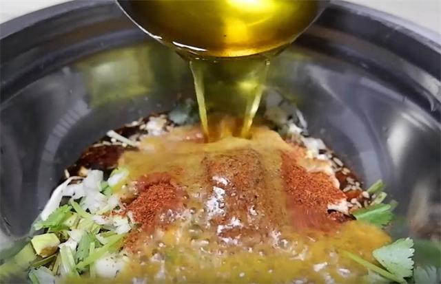 2.加入素蚝油,盐,生抽,陈醋。芝麻、孜然、辣椒粉,浇一勺热油炸香。