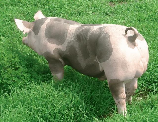 一 外形特征 皮特兰猪的体型是中等大小,身体是圆柱形,腹部和腰背平行,肩部肌肉丰满,背不仅直还很宽大;身上的毛发是灰白色,身上有不规则的深黑色斑点,当然也会夹杂着一些棕色的毛发,棕色毛发通常会在黑斑外到渐进到白色的灰环当中;头部清秀,颜面平直,嘴大且直,双耳略微向前;肌肉丰满紧凑,背腰肌和腿肉发达,不过跟其他猪比起来,皮特兰猪的腿更短。