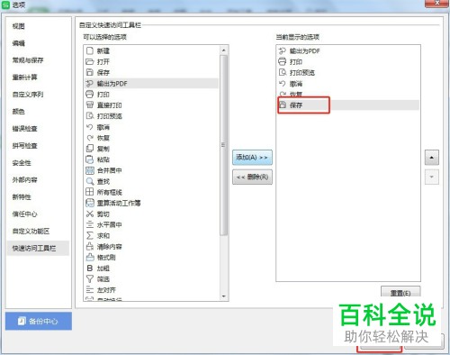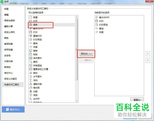 4. 第四步进入【选项】页面后,根据下图所示,点击左侧菜单栏中的【快速访问工具栏】选项。 5. 第五步在右侧【自定义快速访问工具栏】窗口中,根据下图所示,找到并点击【保存】选项,然后点击【添加】。