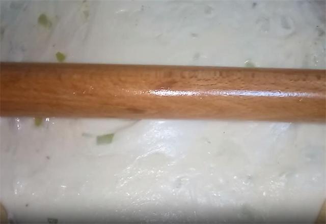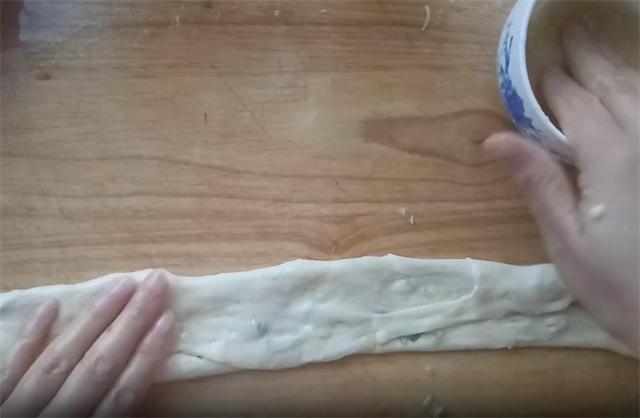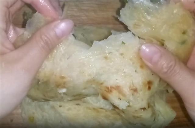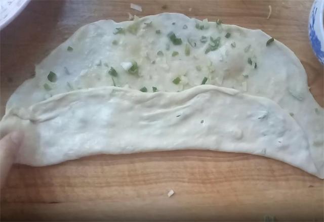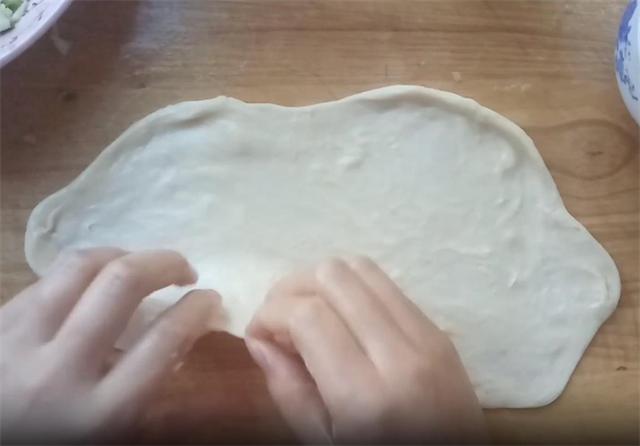 6.对于边缘较厚的部分,用手指轻轻按压至薄,随后均匀涂抹上之前调好的油酥,再撒上切碎的葱花,接着,像这样把饼拽起来,向后边抻边拽,然后把它折叠。