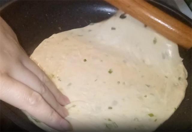 11.起锅开小火,锅热之后刷上薄薄一层油,利用擀面杖辅助将饼卷起并滑入锅中,避免手工操作导致饼形受损。