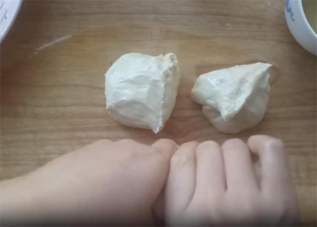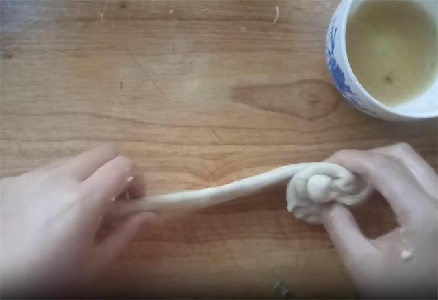 5.取其中一个剂子,轻轻按压成椭圆形,然后用手缓缓向外拉伸,直至面饼薄而均匀。