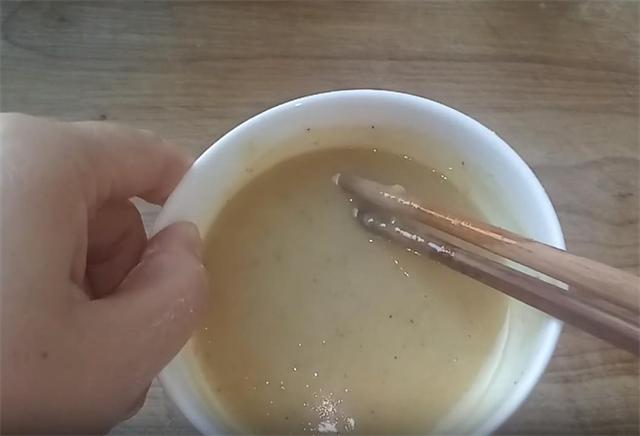 2.下面我们开始制作油酥,油酥的关键在于面与油的比例,大约为1:2。取20克面粉,加入一勺五香粉拌匀,再将40克植物油烧热后缓缓倒入面粉中,同时不断搅拌,直至形成粘稠的糊状,备用。