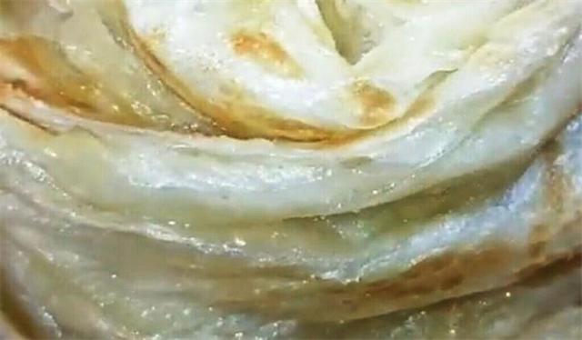 10.接下来使用擀面杖轻轻擀压饼坯,保持其层次和纹理,这样擀做出来的饼才会层次分明,把饼翻过来,这时可以用力把饼擀开了,朝各个方向把它擀薄擀均匀,擀至约2厘米厚度,此时饼已呈现出清晰的层次,就可以准备下锅了,这个厚度的饼容易烙熟,烙制的时间短,所以饼口感比较软。