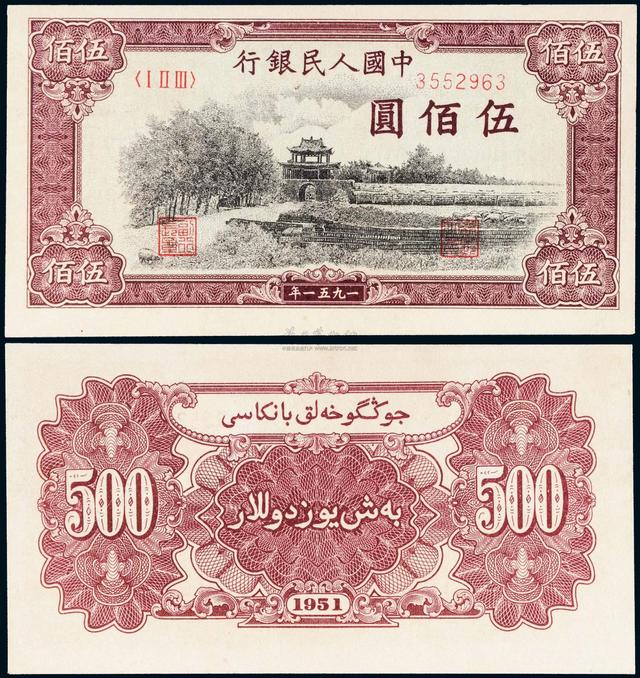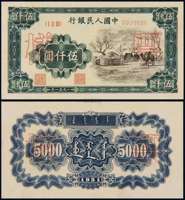 作为四大天主之一骆驼队是非常的罕见,在近几年的拍卖会中都没有出现过几张,这种1951年的1万元纸,在壁面上有一骆驼非常的好认,由于只在新疆地区投放,所以它在大部分地区都是极难找到的。