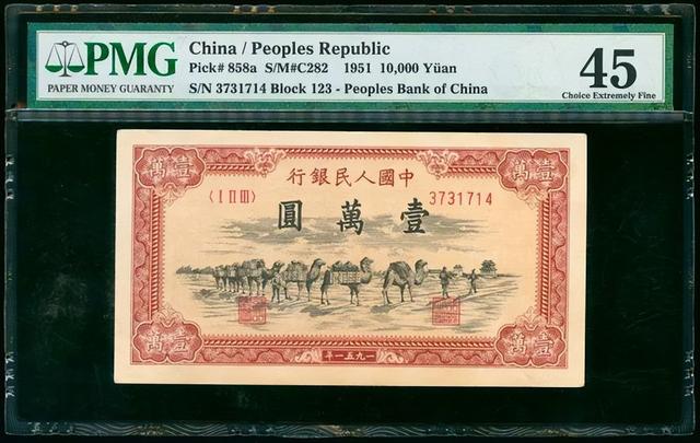 这是因为一版币的版别非常多,不同地区流通使用的纸币还不一样,由于能留存到现在的非常稀少,一张PMG45分的骆驼对纸币,就能拍出40多万了,这样的老纸币你家里是否还留着呢?随便找到一张天王币都要好几十万了,如果品相好几百万一张也不成问题。 |
