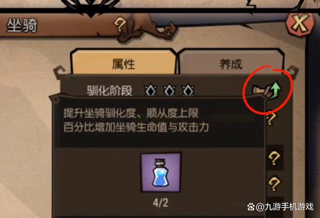 获得了坐骑之后,还能在坐骑页面进行培养。点击坐骑页面的鞍和药水就能进行驯养,开始驯养后会出现驯养度。驯养分为了3个阶段,不同阶段后出现不同的技能。哞哞驯化到3阶段后能够在战斗时给予玩家很多的输出攻击。