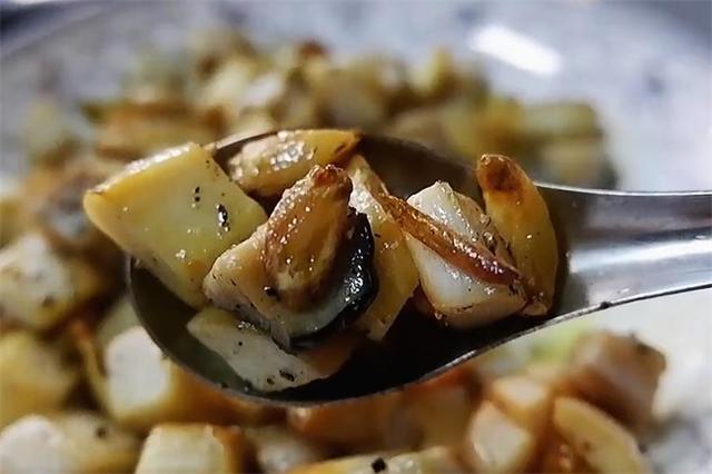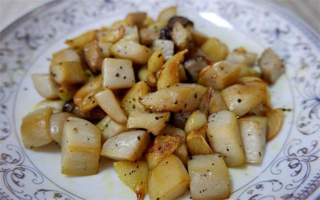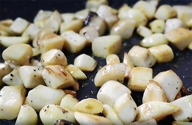 5.蒜刚刚变焦后,加入杏鲍菇,小火慢慢煎蒜煎软,杏鲍菇周围渐变黄,撒上新鲜的黑胡椒粉。