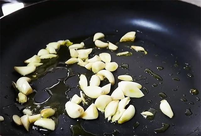 4.平底锅加油,下入蒜,小火把蒜煎香。