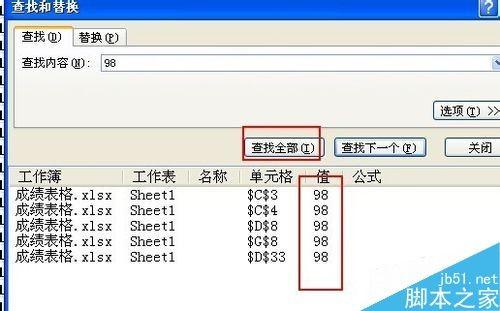 9、点击查找下一个,我们可以依次找到所有的98分的