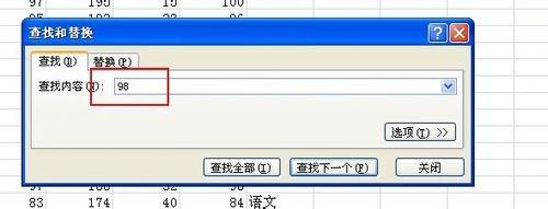 8、如果说我们需要依次找到98分,一个个找或者一次性全部修改为99,那么我们在查找中输入98