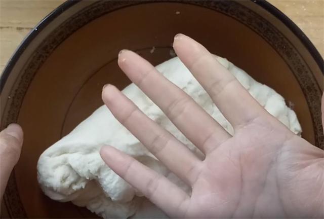 5.我们把醒好的面团,像这样用手按压成椭圆形的面饼,因为这个醒好的面团它特别的柔软,所以根本不用太用力就可以把它延展开了。