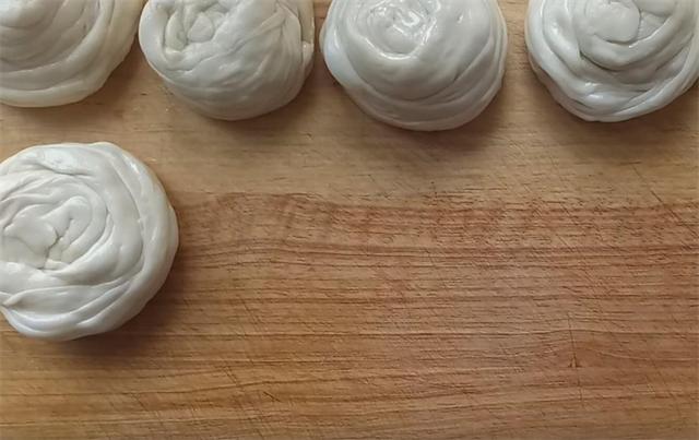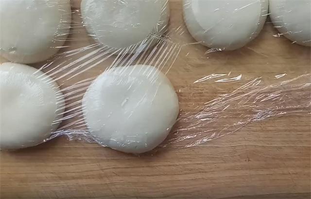 9.我们一次可以多制作一些这样的手抓饼的面坯,把它擀好用保鲜膜包起来,然后放在冰柜冷冻就可以了,吃的时候拿出来直接就可以烙制,不用解冻,饼坯做好之后,我们再醒面五分钟,使其更加的柔软,手指按压不回弹就可以擀饼了。