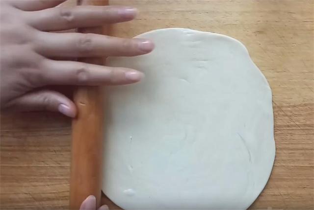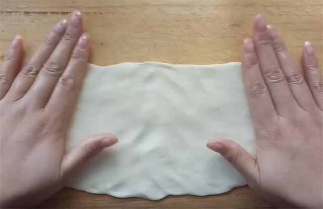 10.擀制的时候,先要轻轻地擀,不要破坏它本身的层次,然后翻过来再把面饼擀薄擀均匀,擀到2毫米的厚度时就可以。