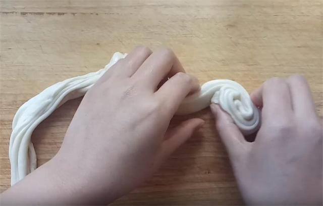 7.然后我们边拉伸边向后拽,像这样把整个面皮叠成扇子褶。