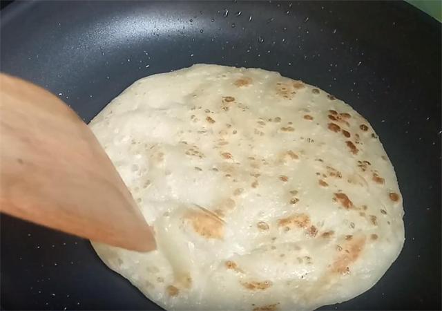 11.锅中只需放一点点的油,然后开小火下入面饼,轻轻晃动一下,把油沾均匀,烙至表面微微变色的时候翻面,翻过来之后,看到这一面微微鼓起的时候,然后再翻过来,因为我们和面的时候已经加入过植物油,所以说烙制的时候油自然会分泌出来,就不需要太多的油了。