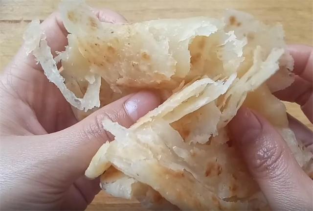 6.像这样用手向各个方向拉伸,抻薄抻均匀,尽量的让面饼薄一些,这个时候我们少许的抹上一些油,这样能够增加饼的层次感,油要抹均匀一些,防止擀制的时候面皮粘连,减少层次感。