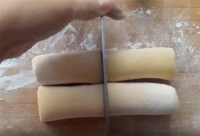 2.揉至面团光滑的时候,我们在案板上撒上少许的干糯米粉,把面团放在案板上搓成长条状,揉搓均匀之后,我们把它切成四个大小相同的面剂,这个面剂的大小按个人的喜好也可以切的再小一些。