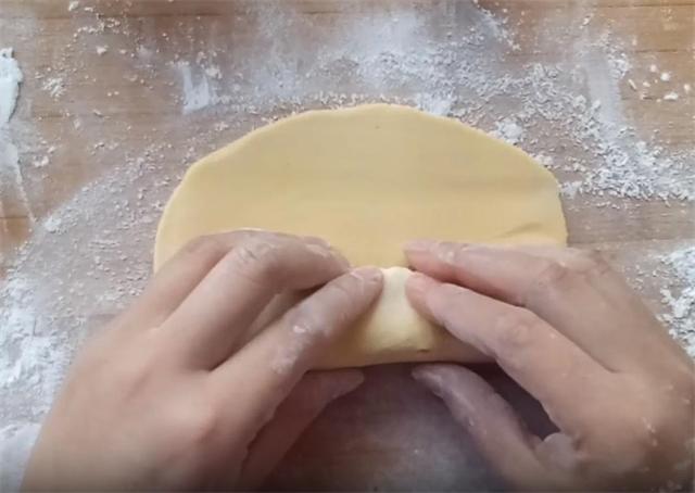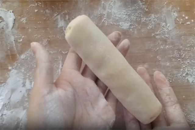 5.我们把面卷的两头捏合,中间轻轻的按压,防止面卷散开,抹上清水是为了让它更好的粘合不至于散开,接下来我们把它搓圆,搓的时候不要用力,这样豆子就会把面皮扎破,因为这个面皮是一点筋性都没有的。