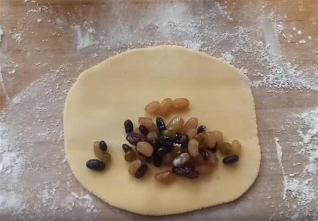 3.我们把面剂按在面板上滚搓圆润,然后用手把它按扁,按成长方形,用擀面杖把它擀薄擀均匀,擀至大约3毫米的厚度的时候,加入蜜香豆,喜欢吃豆沙馅的也可以放入豆沙。