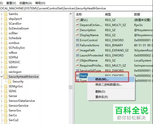 4. 在“SecurityHealthService”下,在打开的右侧窗口中,找到【Start】选项,右键,在打开的菜单中,选择【修改】选项。