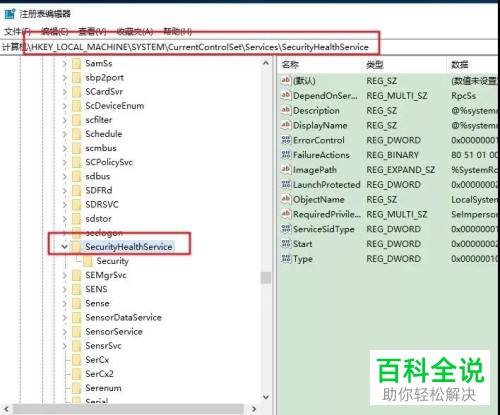 3. 在打开的注册表编辑器页面,依次展开: HKEY_LOCAL_MACHINE\SYSTEM\CurrentControlSet\Services\SecurityHealthService