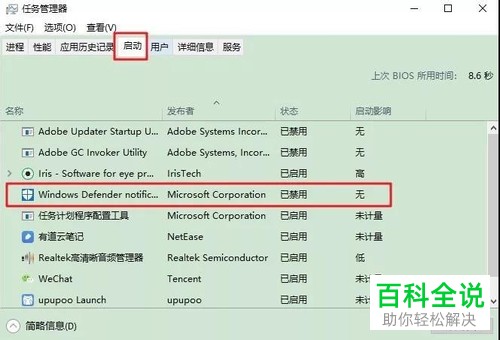 7. 在打开的页面,上方切换到【启动】选项下,在打开的列表中,找到“Windows Defender notification icon”,右键,选择禁用(若有两个相同,全部设置为禁用),最后重启电脑即可。