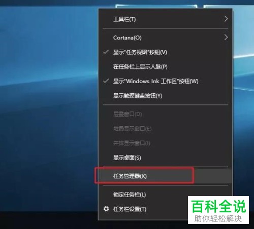 6. 接下来,返回到桌面,在任务栏空白位置,右键,在打开的菜单中,选择【任务管理器】选项。