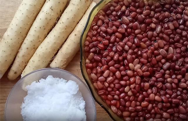 1.今天教大家做一个开胃健脾、美容养颜的山药红豆糕。准备材料有山药一根,泡发一夜的红豆,白糖适量,红豆提前泡好,一是能够缩短煮制的时间,二是能够使口感更加的软绵。