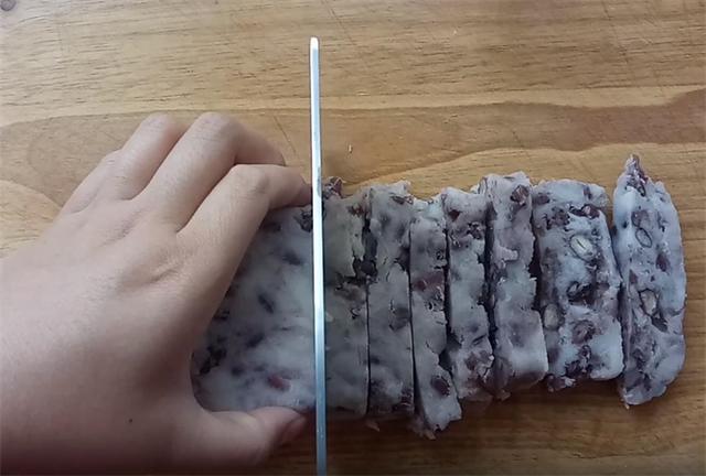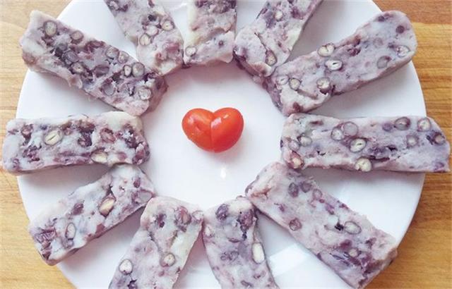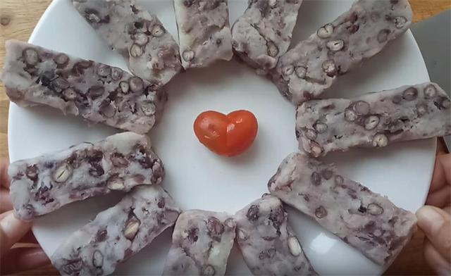 6.把煮好的豆子和山药泥加在一起搅拌均匀,然后放在案板上做成自己喜欢的形状,切开摆盘。