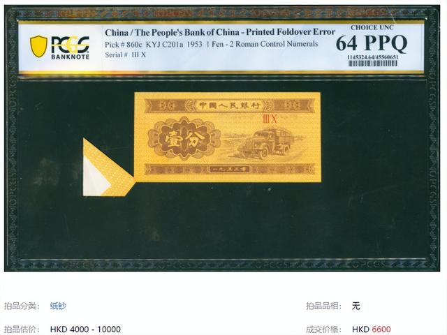 比如上面这张奇特的无号1分,就曾在SBP拍卖会中,拍出6600港币。 它其实是一张典型的福耳币,是纸币在印刷中,纸张出现折叠导致的。
