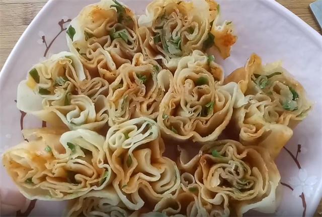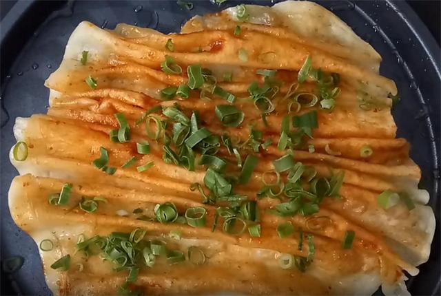 9.我们把饼用筷子夹住,翻过来,然后均匀的刷上蒜蓉酱,褶皱里面也要刷上少许的蒜蓉酱,这样吃起来的盐度才会更均匀,我们撒上切好的小葱碎,最后我们把饼卷起,这样吃起来更加的方便。