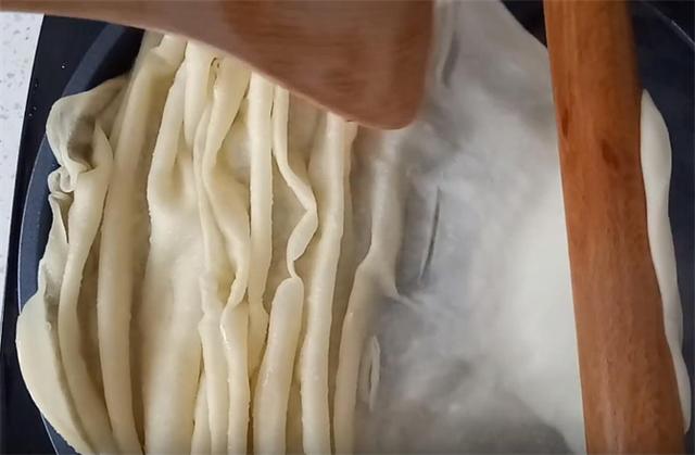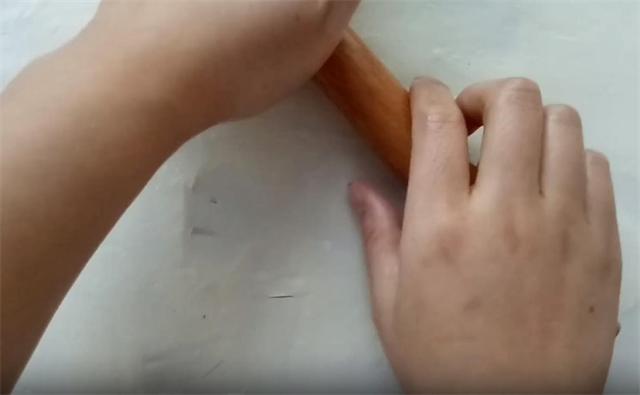 6.我们把面饼擀至半透明状的时候,用擀面杖把面饼卷起来,边卷边向后面拉伸,使其再次变薄,增加筋性。