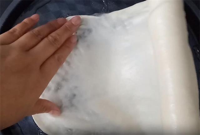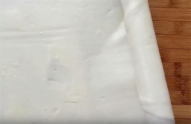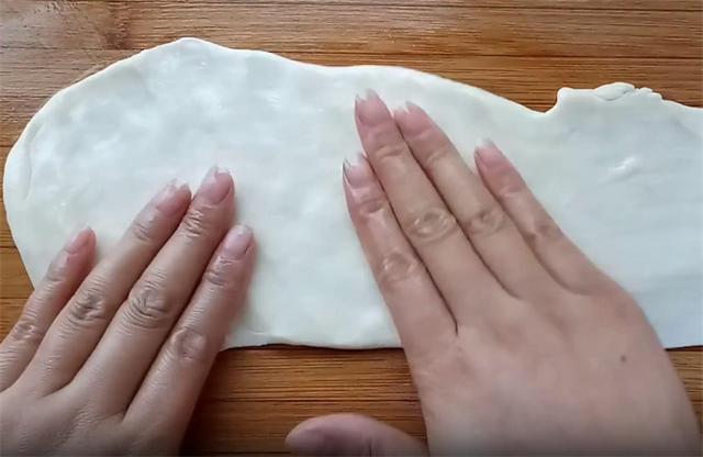 5.用手把薄厚不均匀的地方按压均匀之后,再用擀面杖擀的更薄更均匀,这样一会我们拉伸的时候,它才不会断,擀的越薄越均匀,这样烙制出来的饼才会更加的筋道。