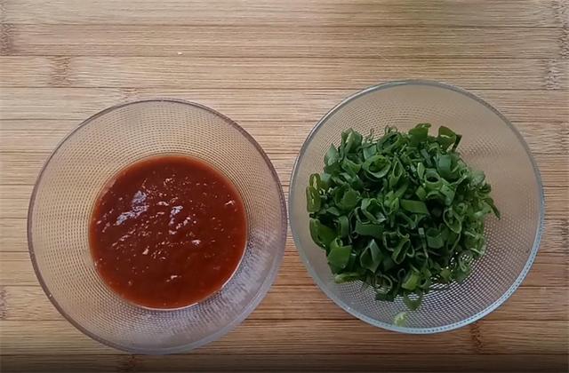 3.接下来我们准备配料,小葱叶一把切碎备用,然后蒜蓉酱适量,因为这个酱本身就是熟酱,所以说不用再熬制。